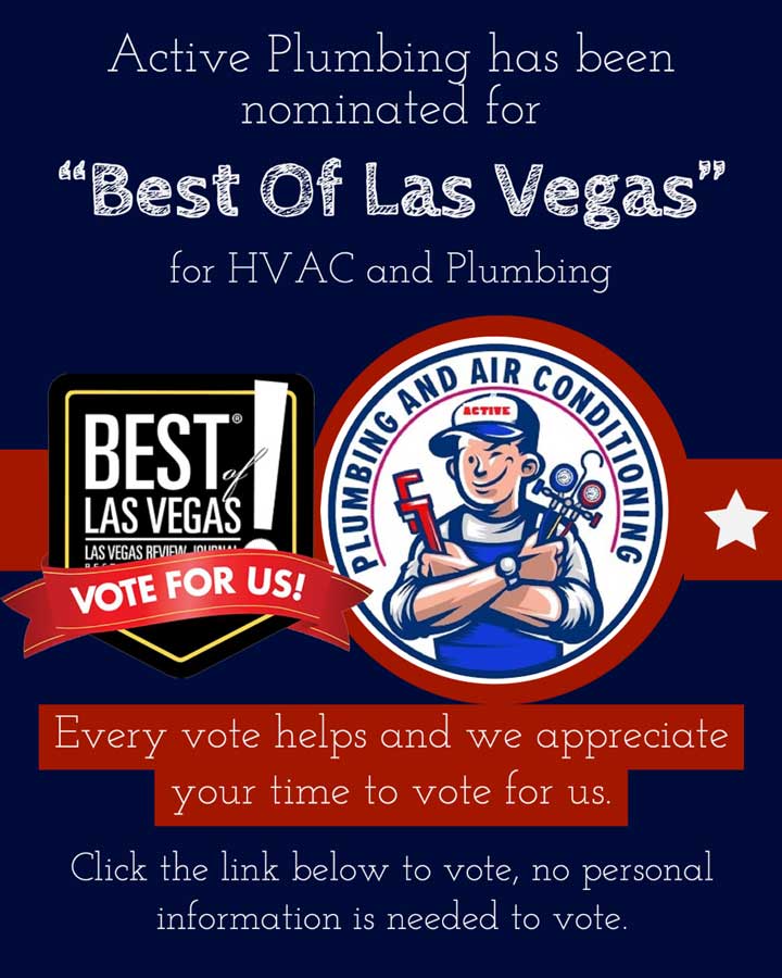 Active Plumbing has been nominated for “Best Of Las Vegas” for HVAC and Plumbing. Every vote helps and we appreciate your time to vote for us. Click the link below to vote, no personal information is needed to vote.